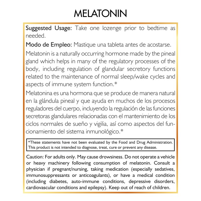 Caution:  For adults only. May cause drowsiness. Do not operate a vehicle or heavy machinery following consumption of melatonin. Consult a physician if pregnant/nursing, taking medication (especially sedatives, immunosuppressants or anticoagulants), or have a medical condition (including diabetes, auto-immune conditions, depressive disorders, cardiovascular conditions, and epilepsy). Keep out of reach of children.