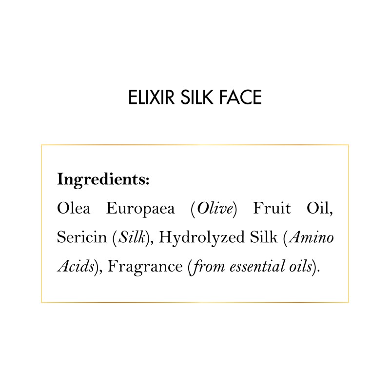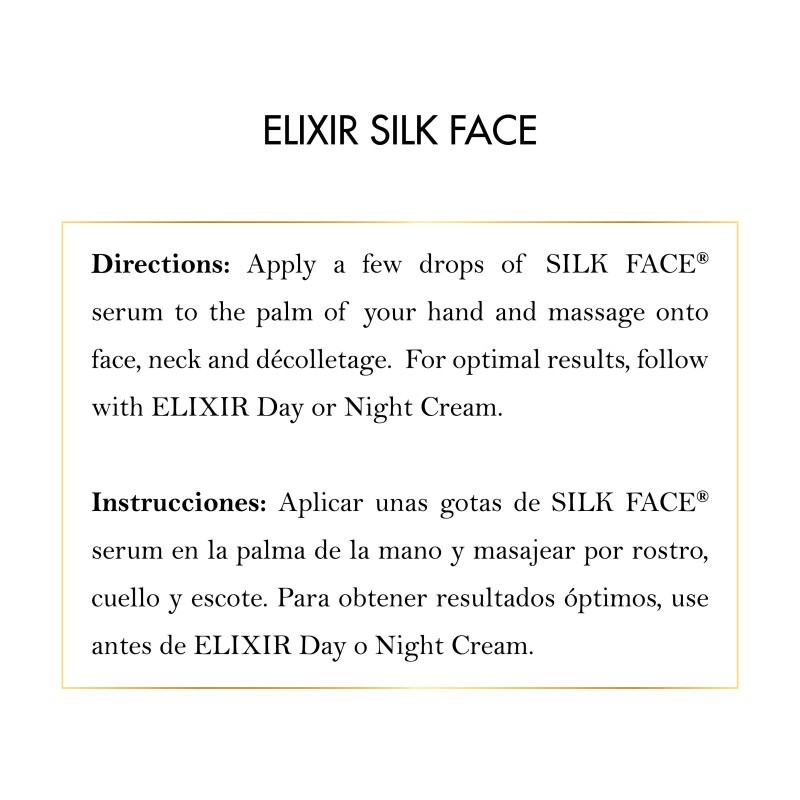 Directions: Apply a few drops on the palm(s) of your hands and softly massage on face, neck and neckline until absorbed. It can be applied to dry or damp skin. For best results apply SILK FACE SERUM and follow with Elixir DAY or Elixir NIGHT Cream.