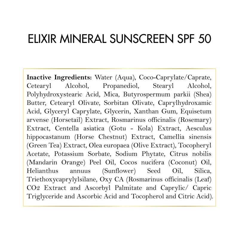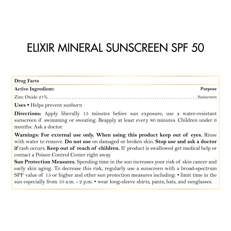 • Healthy formula: Elixir Mineral Sunscreen contains ingredients that are abundant in antioxidants that enhance skin health and hydration.