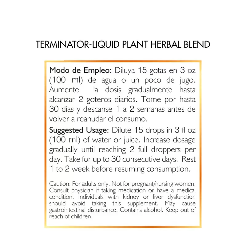 Empleo: Diluir 15 gotas en 3 oz (100ml) de agua o un poco de jugo. Aumente la dosis gradualmente hasta alcanzar 2 goteros diarios. Tome por hasta 30 días y descanse 1 a 2 semanas antes de volver a reanudar el consumo.