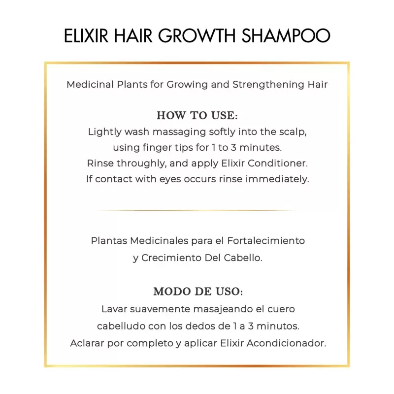 Modo de uso: Lavar suavemente masajeando el cuero cabelludo con los dedos de 1 a 3 minutos. Aclarar por completo y aplicar Elixir Conditioner. Evite contacto en los ojos.